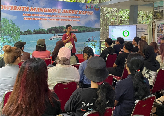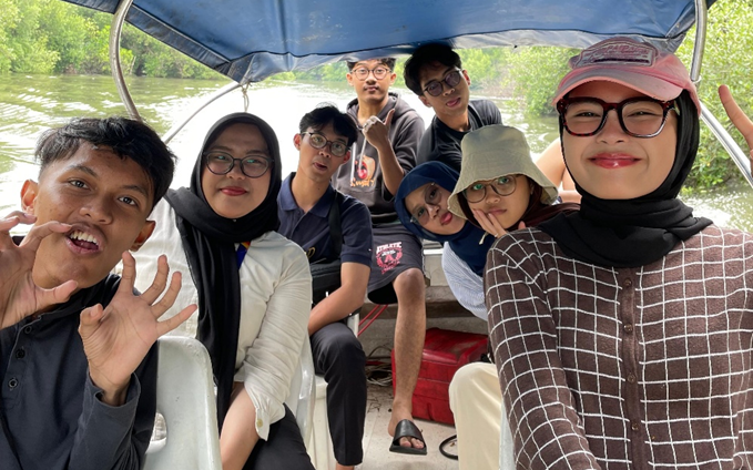 Selain menyimak penjelasan fasilitator mengenai hutan mangrove, mereka tak henti-hentinya mengabadikan momen dengan mengambil foto dan video. Bahkan, ada peserta yang sampai berdiri di bagian depan perahu untuk memperagakan tarian “Anak Coki Pacu Jalur”, yang mengundang tawa dari peserta lain. Di tengah perjalanan, mereka juga melihat seekor burung Pecuk Ular-Asia yang sedang berjemur sambil merentangkan sayapnya di ujung batang pohon mangrove.